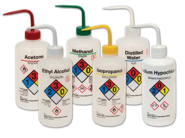 Meet NFPA and ICS labeling standards for chemical containers with Nalgene™ Narrow-Mouth Right-to-Know LDPE Wash Bottles, which use standard, instantly recognizable colors and GHS symbols. These low-density polyethylene bottles are flexible and easy to squeeze for ergonomic dispensing. Made from high quality laboratory grade plastic materials for dependably low leachables and extractables.