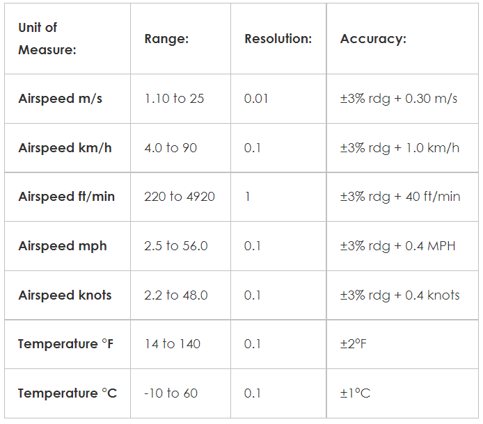 The meter offers the convenience of Bluetooth® for wireless communication with free iOS and Android Apps. Results can also be remotely viewed on your smartphone in real time, saved and exported. This enables the meter to be used as a remote wireless probe and as a data logger. Comes ready to use with instructions, tripod screw, and a 9V battery. Replaceable snap-in anemometer vane is available.